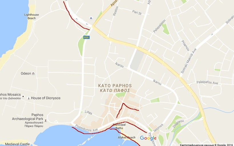 - Так как пляжи в черте города в основном каменистые, то стоит обратить внимание на хороший песчаный пляж «Корал Бэй», который находится в 30 минутах езды от Пафоса. Там же можно и жить, а в город ездить иногда вечерами.