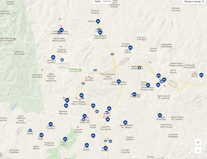 Такси — не самое выгодное средство передвижения на длительные расстояния. Чтобы добраться до гор Троодос на такси, недостаточно просто махнуть рукой. Вам придется позаботиться об этом заранее и найти фирму, которая готова будет вас отвезти. Таксисты в среднем берут 30-35 EUR/час. На мой взгляд, благоразумнее купить индивидуальную экскурсию.