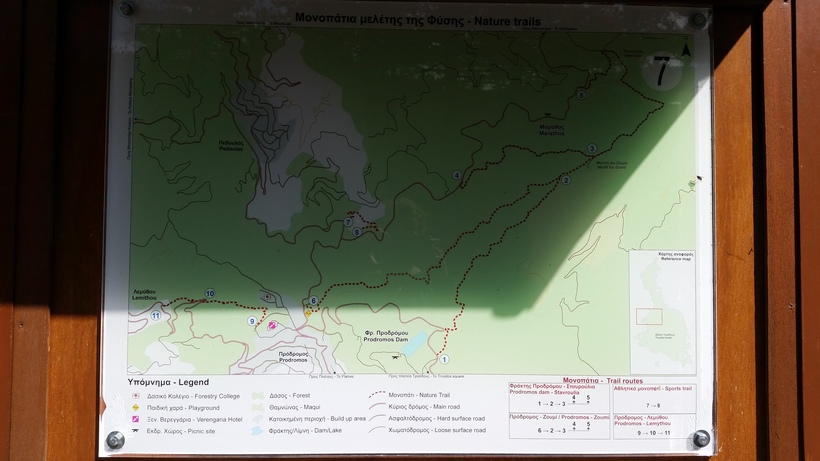 Поклонникам пешей ходьбы — основная масса пешеходных троп расположена около деревни Троодос, вокруг горы Олимбос (смотрим на карте выше кружок 1). Есть маршруты разной категории сложности