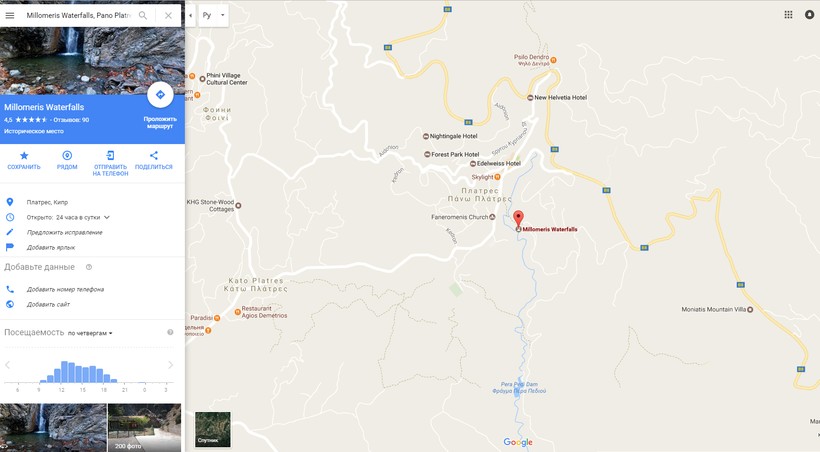 Полезная информация: Начало маршрута: между центром деревни Pano Platres и церковью, ближе к церкви. Конец маршрута: водопад Малломерис (Myllomeris). Протяженность маршрута — 1.2 километра. Время в пути — 30 минут.