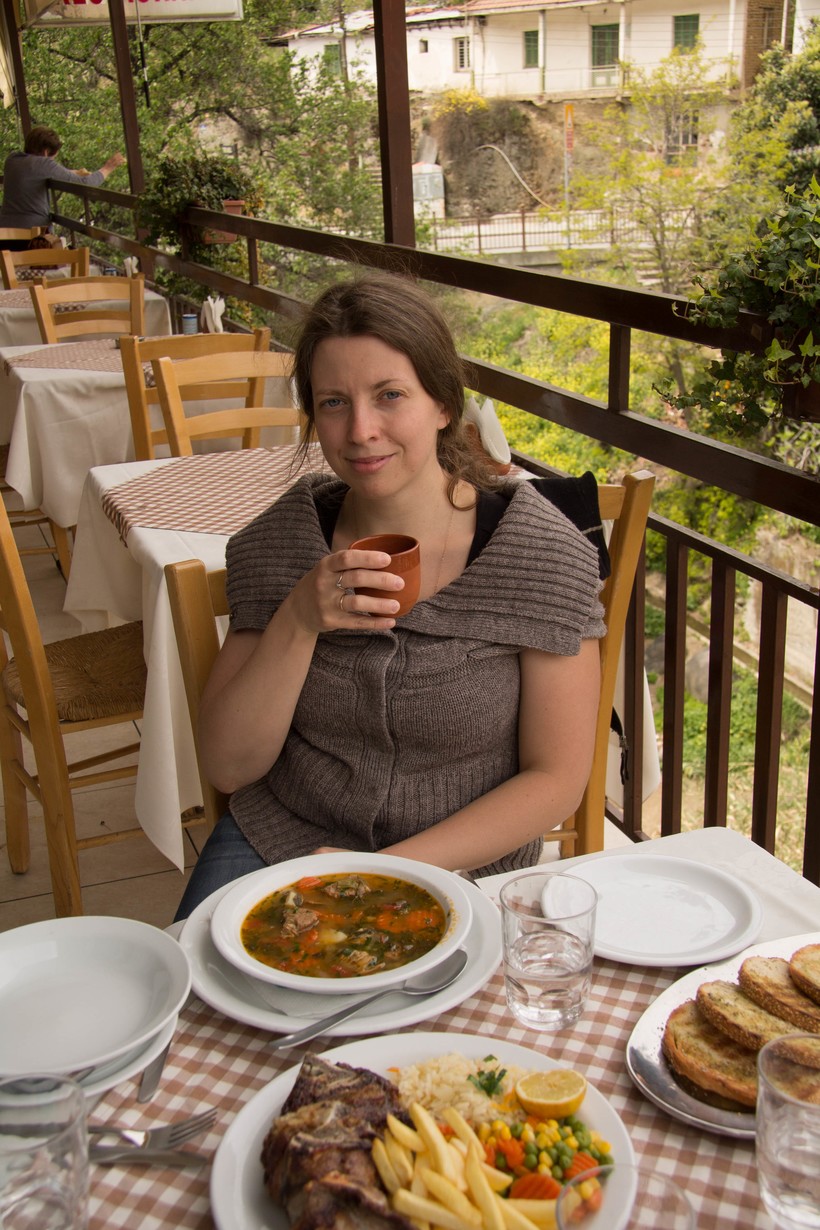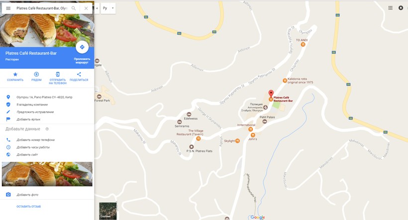 Посоветую вам ресторанчик, который нам очень понравился, Platres Cafe (Olympou 1A, Pano Platres). Он достаточно просторный, есть зал под крышей, большая терраса с видом на городок и горы, для детей — детская комната.