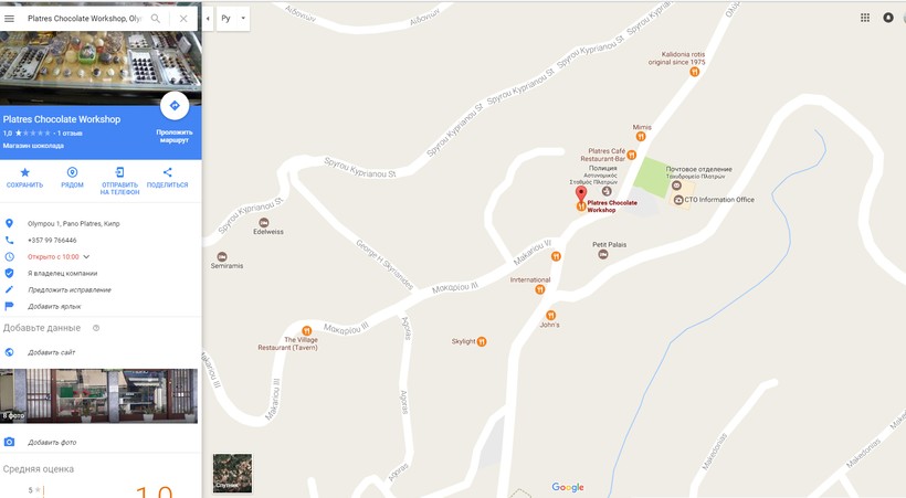 Чем заняться? В поселке есть семейная шоколадная фабрика. Экскурсий на самой фабрике нет, туда попасть можно с организованным гастро-туром. Шоколад там очень дорогой! Адрес: 29 Archbishop Makarios Avenue, Pano Platres.