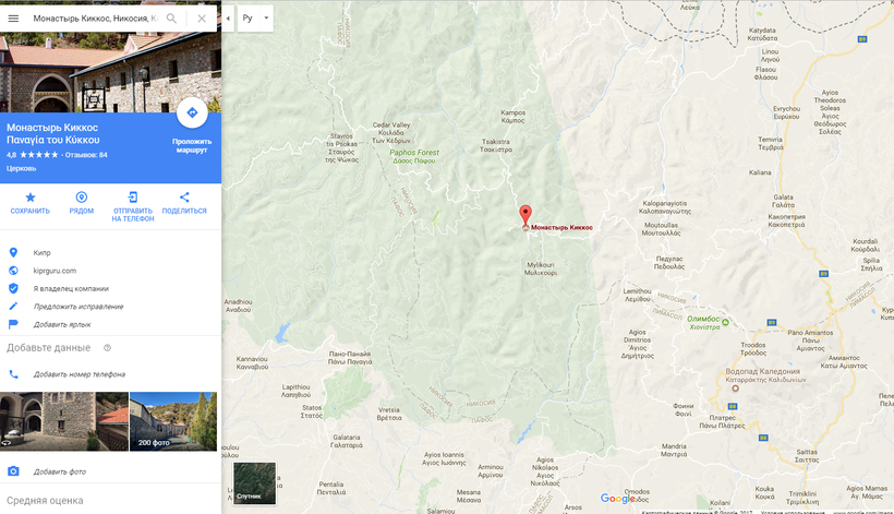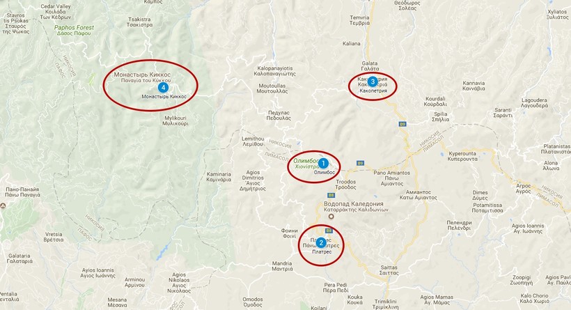Верующим и паломникам — монастырь Киккос (4-й кружок на первой карте).