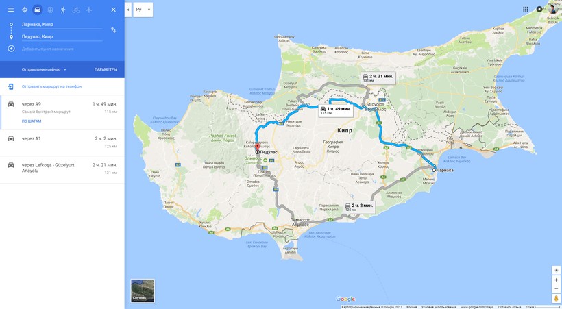 До горного массива Троодос легче всего добраться на арендованном автомобиле. Взять машину в прокат можно в аэропорту или в любом другом городе Кипра. Сделать это можно онлайн (например, через этот ресурс) или зайти в одну из прокатных контор. Более подробно про аренду авто можно прочитать в статье по Ларнаке. Заранее закачайте необходимые вам карты и в путь! Время в пути может быть больше, чем покажет навигатор, т.к. в горы вы будете подниматься по серпантину. Но не пугайтесь, дороги в очень хорошем состоянии! Единственное что: лично мы умножали время в пути, показанное навигатором, примерно в 2 раза. К примеру, мы ехали из центра Ларнаки в деревню Педулас около 3 часов. На карте ниже 3 варианта маршрута. Мы ехали туда по "синему" варианту, обратно через Лимассол.