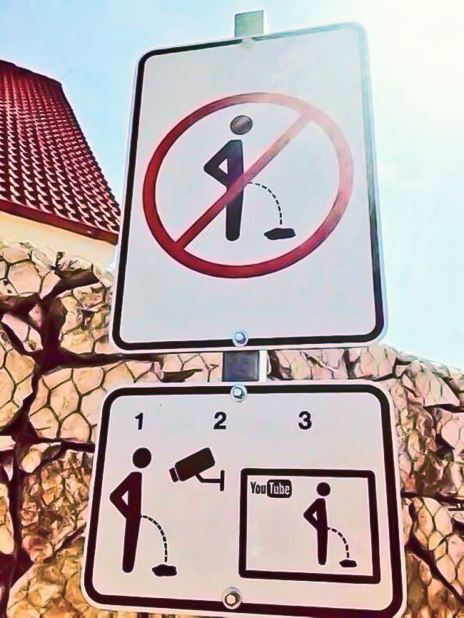 - «Не справляйте нужду на улицах». Этот знак, кстати, позволяет прославиться тем, кто его не соблюдает.