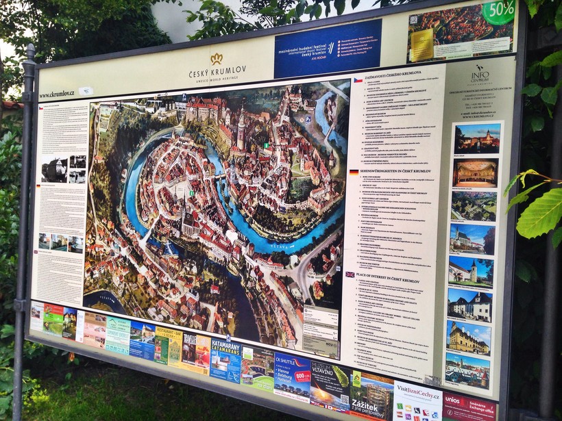 Изучать Чески Крумлов пешком легко и приятно. Город небольшой, и вы точно не заблудитесь. Если вы прямиком с автовокзала пойдете его покорять, то по пути обязательно наткнетесь на подробную карту города. Такие карты встретятся вам не раз.