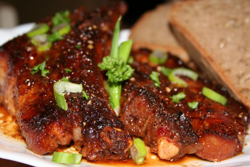 Это печёные свиные рёбрышки в меду. Как и в случае с уткой, мёд добавляют для хрустящей румяной корочки. Он также придаёт мясу мягкость и сочность.