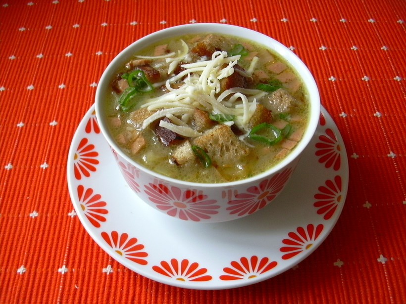 Это чесночный суп. Иногда его готовят с копченостями, но по традиционной рецептуре в нём должен быть мясной бульон, картошка и, конечно же, чеснок в большом количестве. Также встречаются вариации с добавлением сыра. Кроме того, этот суп можно отведать как в традиционном виде, так и в измельчённом до состояния пюре. В первом варианте я пробовала его в рождество, в каком-то ресторане в средневековом стиле близ Староместской площади. К сожалению, названия уже не вспомню, но согреться и утольить голод в этом заведение помогли.