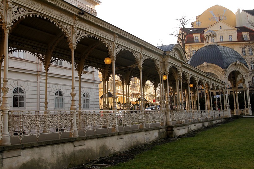Эффектная колоннада, построенная в XVI веке. Источник, бьющий из нее, считается самым горячим на курорте. Температура источника, который здесь бьет, – +72°C. За свою долгую историю колоннада претерпела немало изменений. Сначала она была выполнена в стиле барокко, потом примерила стиль ампир. После первого ремонта стала чугунной, после второго – деревянной. В 1975 году конструкцию заменило современное железобетонное строение в стиле функционализма. Архитектор новой колоннады - Ярослав Отруба.