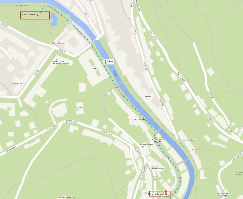 - Общественным транспортом из центра. Если вы находитесь в районе рынка (Tržnice/Тржнице) то можете сесть на автобус №1 или №4 и доехать до остановки Lázně III. Это конечная, так что не запутаетесь. Оттуда до садов Дворжака 3 минуты ходьбы. Вам нужно будет перейти всего один мост через красавицу Теплу.