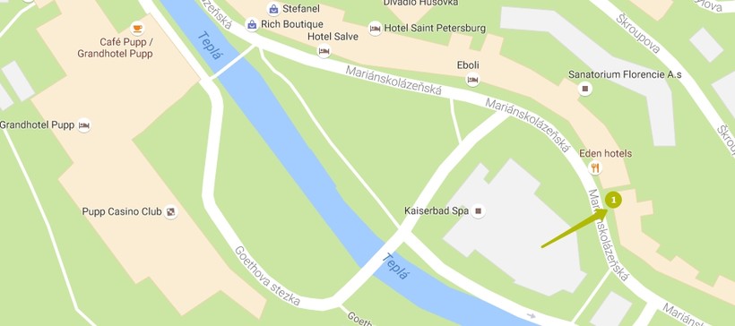 Ресторан расположен около Рыночной и Гейзерной колоннад в центре Карловых Вар. Рядом Charlie Gallery, кино, набережная Теплы.