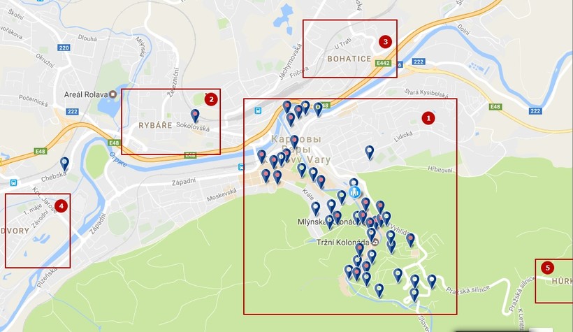 Несмотря на то, что Карловы Вары – весьма компактный город, здесь есть ярко выраженные туристические районы (центр) и места, где проживают местные жители. Нередко иностранцы приобретают недвижимости и по прошествии нескольких лет благополучно вписываются в ряды истинного чешского населения. Вот карта с основными районами курорта.