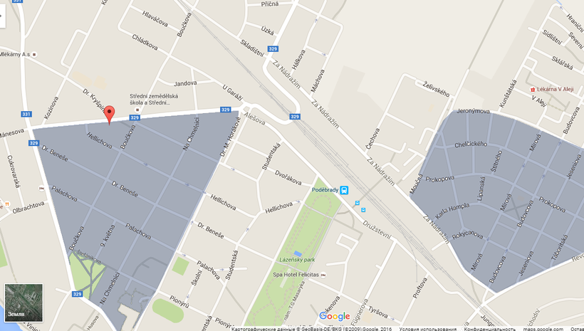 Но, тем не менее, наиболее дорогими (в сравнении с остальными) остаются дома в частном секторе Podebrady 2 (на карте выделен синим, район слева) и Podebrady 5 (справа). Цена комнаты в таком доме составит не менее 185 EUR (5 000 CZK) в месяц.