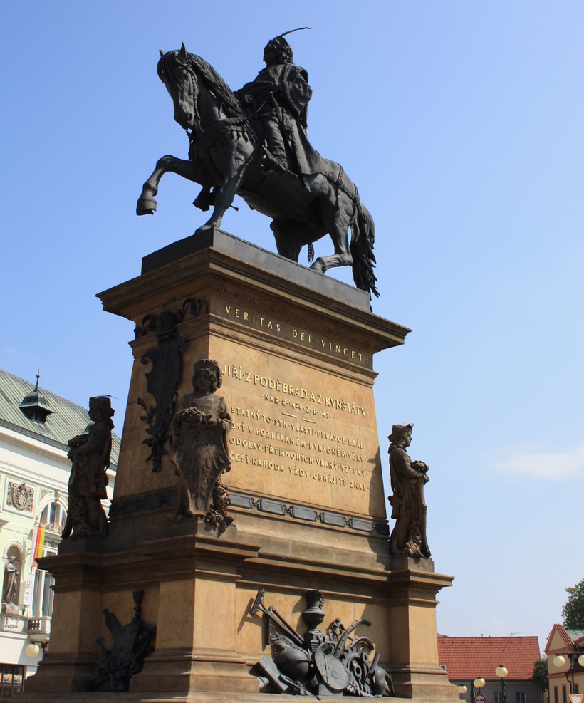 С именем короля Йиржи в Подебрадах связана еще одна достопримечательность маленького города: на центральной площади, носящей имя короля, стоит памятник Йиржи.