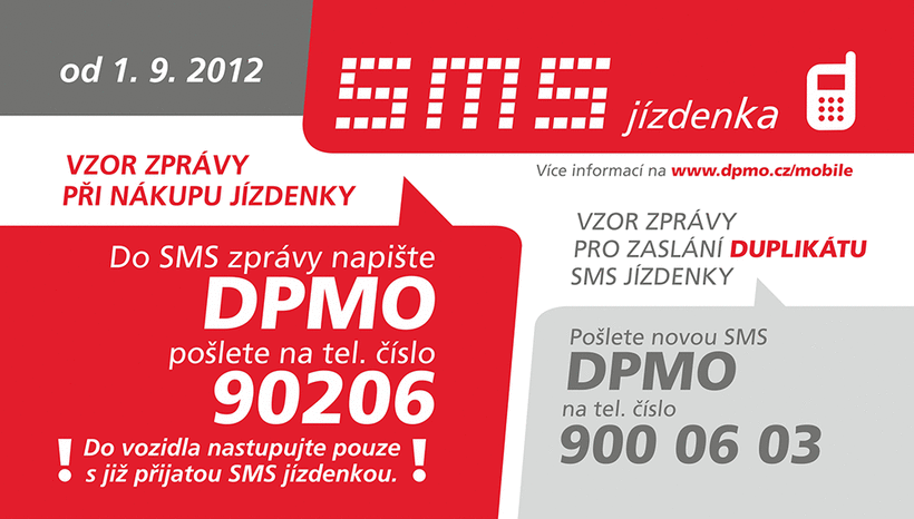 Кроме традиционных способов покупки билетов в общественном транспорте есть и такой вариант. Для покупки через СМС отправьте сообщение с текстом «DPT» и кодом нужного билета на номер, написанный на дверях транспорта (коды указаны здесь же). Ответ придёт в течении 1 – 2 минут. Стоимость будет состоять из номинала билета, а также цены отправки текстового сообщения, если у вас роуминг или тариф с платными исходящими. После отправки придёт текст с подтверждением, на который нужно ответить «Ano», что по-чешски означает «Да». Только после этого вы получите электронный билет.