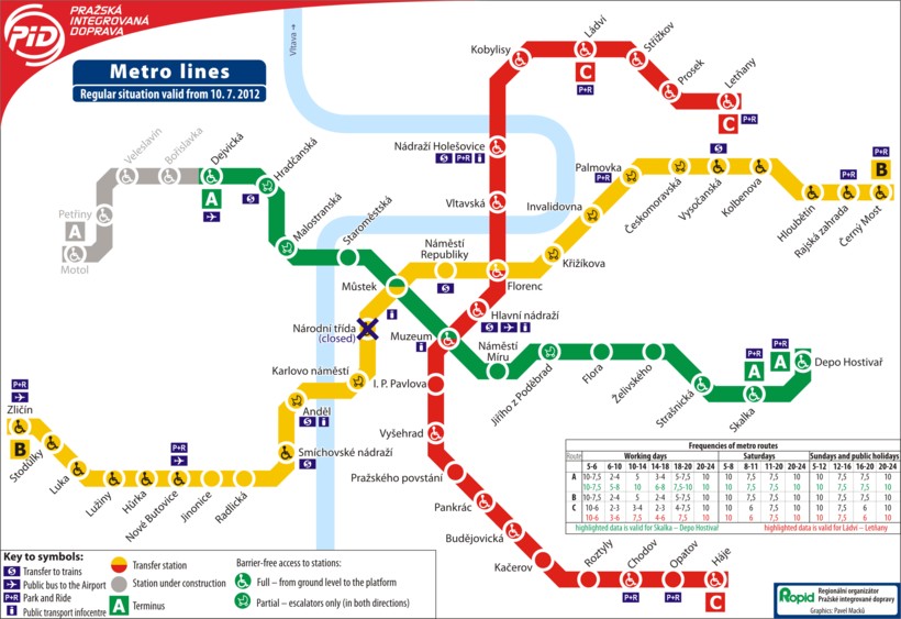 Метро в Праге ходит по трём линиям: A - красной, B - желтой, C - зелёной. Пересадочные станции располагаются в центре города. Всего их три.