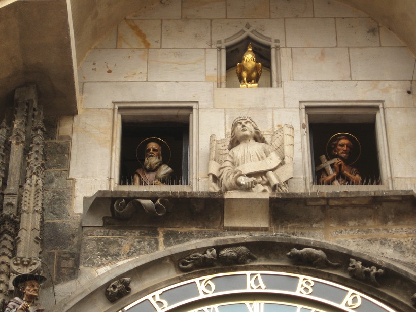 Как уже было сказано, все скульптуры, украшающие часы, появились не разом. Насколько я поняла из рассказов местных, изначально в каждую был вложен какой-то смысл или сравнение с реалиями определённого времени. Но из-за многочисленных реставраций уже мало кто может вспомнить их истинное значение. Например, петух и ангел задумывались амулетами от сверхъестественных сил. Но сейчас они не более чем статичные декорации.