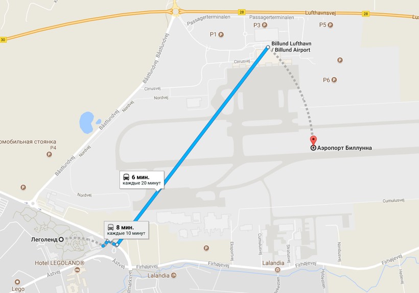 Аэропорт Биллунда находится прямо рядом с парком – неудивительно, ведь строила его сама компания LEGO. Можно даже пешком дойти, но, если вы с багажом, проще воспользоваться бесплатным автобусом-шаттлом, который ходит от аэропорта прямо к «Леголенду», вам нужна остановка Legoland / Lalandia (на карте ниже).