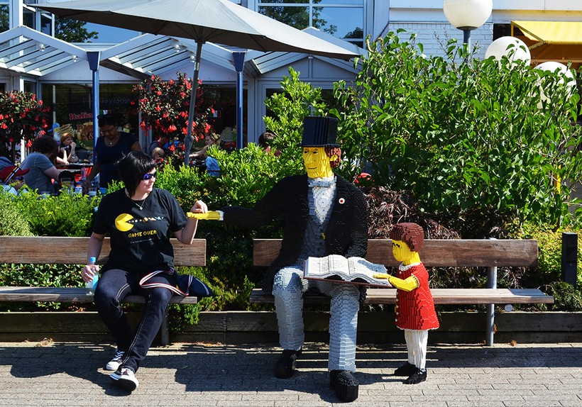 А на другой лавочке неподалёку сидит Ганс Христиан Андерсен, сделанный из LEGO – знаменитый сказочник, без которого в Дании не обойтись. Это наоборот уникальный для парка персонаж, который есть только в Биллунде.