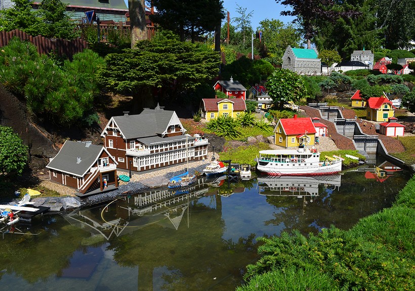 Это самая интересная зона парка. Родители тут носятся между красочных домиков с ничуть не меньшим восторгом, чем дети :). Минилэнд производит огромное впечатление не только своей красотой и реалистичностью, но и тем, что тут всё автоматизировано: идут по рельсам поезда, по настоящей воде плывут корабли, а кое-где пляшут LEGO-человечки. Это и правда настоящий живой маленький мир! А над ландшафтами тут явно потрудились не меньше, чем над самими постройками.