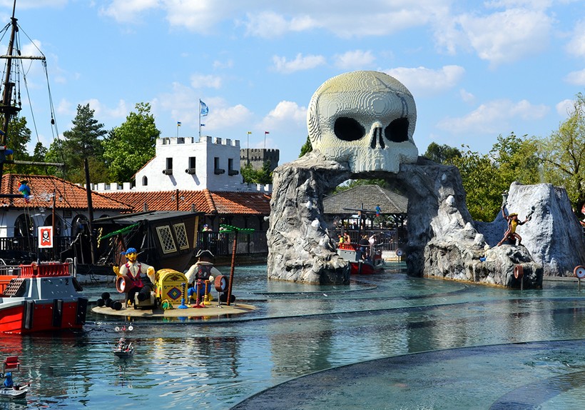 Поворачиваем направо и попадаем в Пиратскую страну, посвящённую одной из самых популярных серий LEGO. Вы её сразу узнаете по огромному черепу, видному издалека. Здесь много аттракционов – в основном водных, особой любовью среди которых пользуется Pirate Splash Battle – пиратское сражение, где противники плавают на кораблях и брызгают друг в друга из установленных на борту пушек. Эта зона понравится детям, хотя, по моим наблюдениям, родители сражаются с не меньшим азартом :).