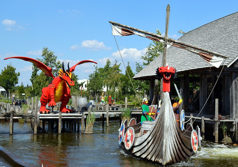 Ещё одна тематическая зона, как и Пираты, посвящённая популярной серии конструкторов. Здесь главной темой являются рыцари, драконы и викинги. Советую заглянуть в большой Королевский замок (увидите его издалека) или сплавиться вниз по водопаду на экстремальных водных горках Vikings River Splash.