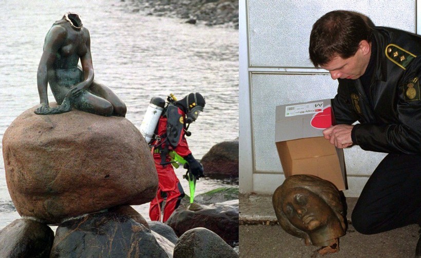 - 1964 год. В ночь с 23 на 24 апреля вандалы отпилили ножовкой и похитили голову Русалочки. Трудно себе представить потрясение копенгагенцев, обнаруживших утром символ своего города обезглавленным.