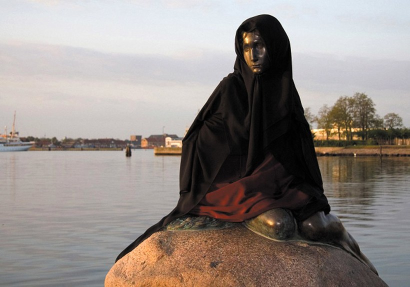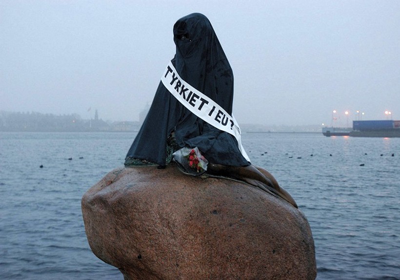 - 2004 год. После взрыва 2003 года таких радикальных актов вредительства, пожалуй, больше не было. Правда, Русалочку с завидной регулярностью обливают краской, но ей не привыкать. Можно сказать, что теперь статуя стала, скорее, средством для выражения политических и социальных протестов, что ещё раз доказывает силу влияния символа датской столицы. Именно к нему обращаются, когда хотят вызвать самый широкий общественный резонанс. В декабре 2004 удивлённые копенгагенцы обнаружили, что их Русалочка закутана в паранджу с надписью: «Турция в ЕС?», что намекало на вступление Турции в Европейский союз, против которого выступала половина жителей Дании.