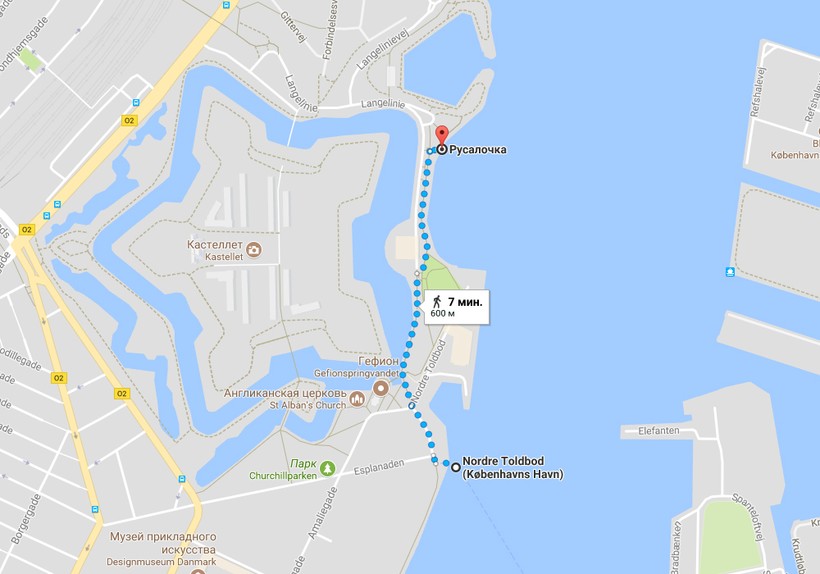 - на электричке или на метро. К Русалочке стоит ехать на электричке S-tog, а не на метро, потому что все станции метро расположены от Русалочки довольно далеко. Вам нужна станция Østerport, доехать до неё можно по любой ветке S-tog (кроме F). До Русалочки от станции идти 15 минут (смотрите карту ниже). Что касается метро, то самая ближайшая станция — это Nørreport, но оттуда пешком идти полчаса. Да и зачем? Ведь из метро можно спокойно пересаживаться на электричку и обратно, по одному и тому же билету.