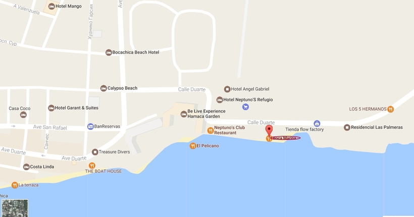 - Если хотите находиться в центре городских событий, то рекомендую присмотреться к вариантам размещения на улице Дуарте. Так вы будете в 5 минутах от пляжа. Но следует учесть, что здесь достаточно шумно, ведь это самая туристическая улица Бока-Чики, а значит бары, кафе и магазины расположены именно на ней.