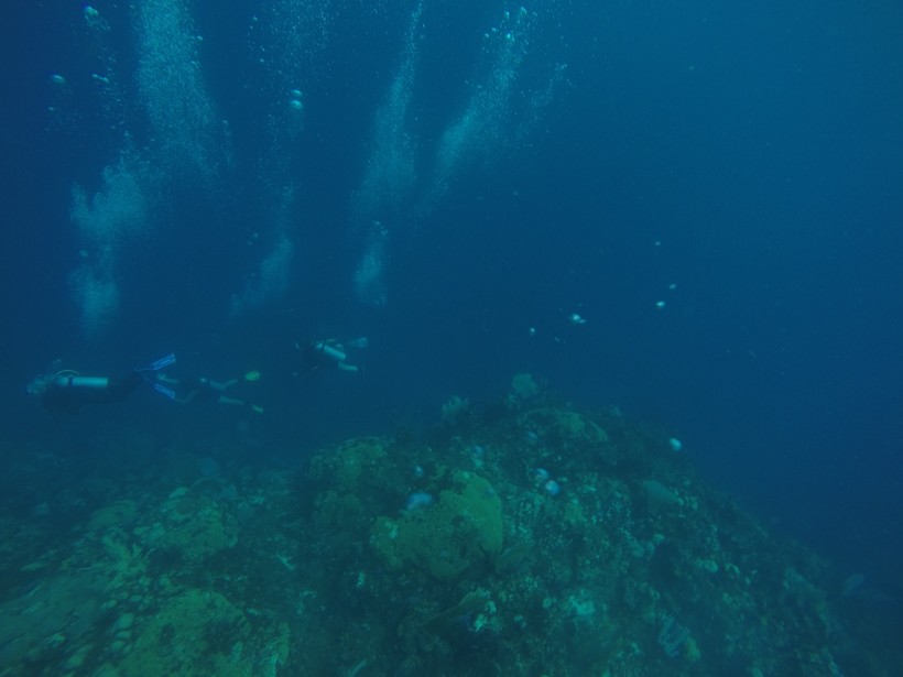 Один из самых популярных и интересных сайтов называется The Wall. На глубине около 6 метров, на краю обрыва, располагается большой коралловый риф, в котором обитает различная живность. Нам не очень повезло с их разнообразием: были только небольшие рыбки желто-сине-серых цветов и ежи. Но говорят, что здесь встречаются персонажи и поинтересней. Несмотря на это погружение получилось довольно хорошим. Помимо того, что местные рыбки оказались ручными (они плавали вокруг нас и даже позволяли дотронуться до них пальцем), огромное впечатление произвел обрыв. От этого резкого перехода рифа в пустоту под ногами, которой нет конца, захватывает дух. Глубина его, кстати, около 40 метров, но мы, к сожалению, на нее не опускались.