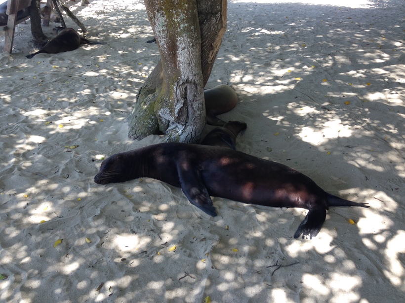 Галапагосы – сюрреализм. Идёшь утром вдоль прибрежной торговой улочки: справа сувенирные палатки, слева море, а тут, откуда ни возьмись, вылетает огромное крылатое нечто и на всей скорости вписывается носом в воду — пеликан. Ладно, пусть так. Встречаюсь с туристической группой, жду лодки — обычный тур. Если бы не морской котик, который прилёг на одном из причалов и нежился на солнце.