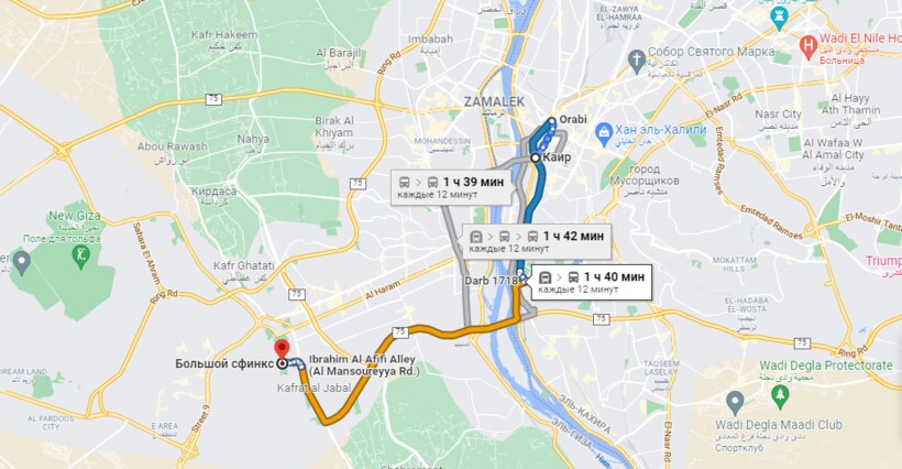 Путь из Каира в Гизу займет около получаса на общественном транспорте. Доехать можно двумя способами: