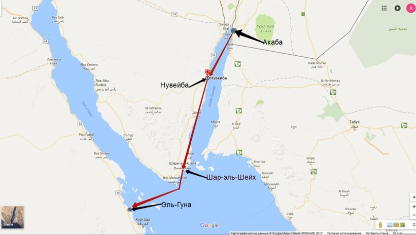Итак, отправная точка — Иордания, Акаба. Весь путь до Эль-Гуны я прочертила красными стрелками.