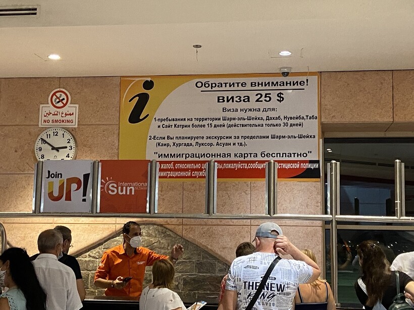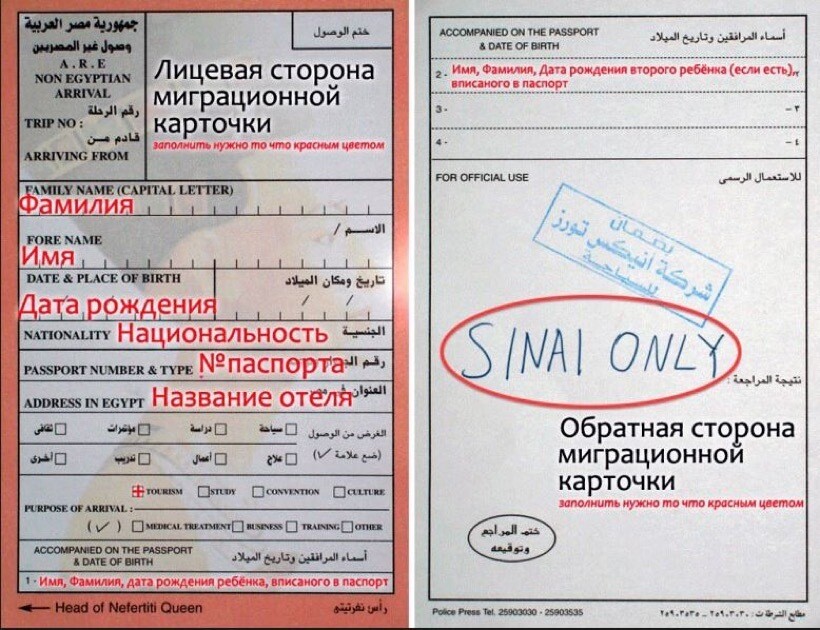 Предприимчивые египтяне предлагают заполнить миграционную карту за туриста. За услугу они просят 5 долларов (350 рублей). Но заполнить документ можно и самому — туда нужно внести элементарные сведения — фамилию и имя, пол, дату рождения, гражданство, номер и серию паспорта, номер рейса, откуда вы прилетели, цель визита и адрес проживания в Египте.