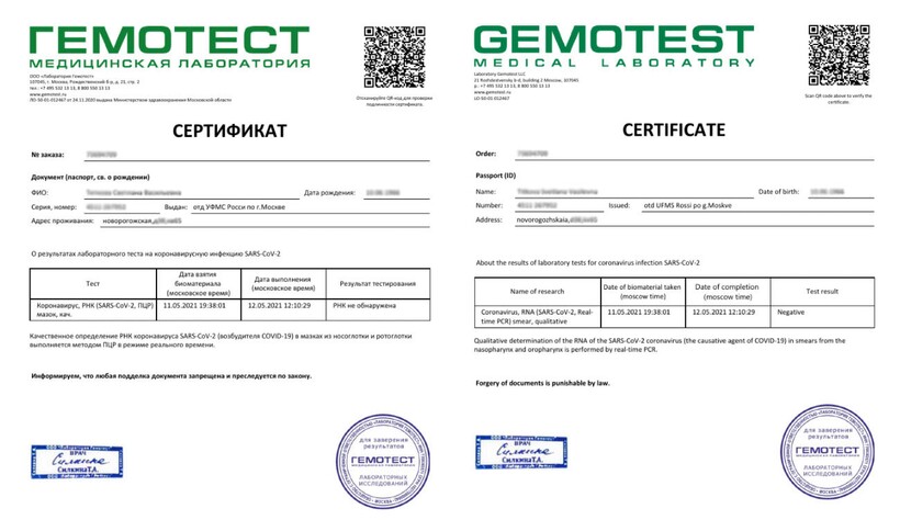 Справка об отрицательном результате ПЦР-теста должна содержать следующие сведения: