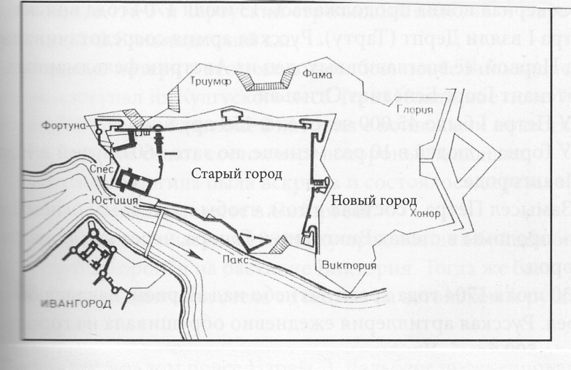Замком нарвские укрепления не ограничиваются. В XVI–XVII веках с развитием огнестрельного оружия стены крепости уже не могли считаться надежной защитой, да и сам город существенно расширился. Поэтому владевшие в то время Нарвой шведы устроили вокруг цитадели систему земляных бастионов. Расположение их указано на схеме.
