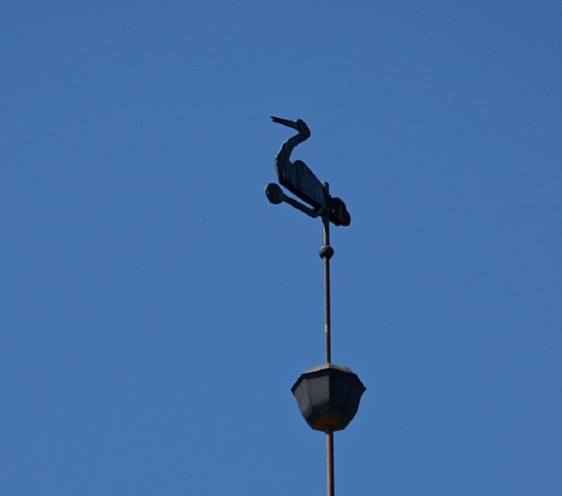 Шпиль ратуши украшает флюгер, выполненный в форме журавля, сжимающего камень в поднятой лапе. Это символ бдительности.