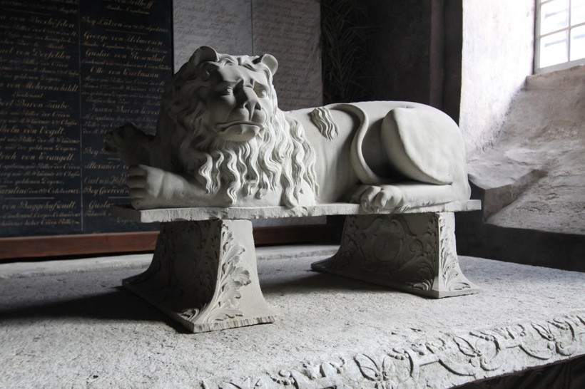 Когда вы решите зайти в храм, я предлагаю на недолго задержаться в его притворной части, где можно заметить за решетчатой деревянной дверью эту погребальную капеллу. В ней располагается не до конца законченный в работе саркофаг знаменитого барона Отто Вильгельма Ферзена (1623–1703) шведского фельдмаршала, который в 1691–1698 годах был генерал-губернатором Ингерманландии и Кексгольма (нынешнего Приозерска). Мне, как петербурженке, интересно было узнать эту историческую ремарку о городке в нашей Ленинградской области. Капелла появилась в соборе XVI веке, а надгробный памятник создан в 1704 г. стараниями и талантом Йохана Стокенберга, скульптора, принявшего активное участие в восстановлении собора после пожарища 1684 года. Саркофаг выполнен в стиле барокко, а на нём прилёг грозный каменный лев, строго взирающий на приходящих туристов.