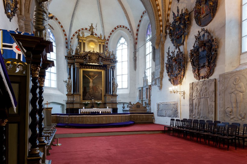 Кстати, надгробие адмирала завершает собой вереницу усыпальниц известных людей, размещенную в Домском соборе. В итоге, в настоящее время здесь представлено 107 гербовых эпитафий. Продолжая разговор о внутреннем убранстве храма, непременно стоит особенно отметить епископскую кафедру (1686 г.) и алтарь (1696 г.) работы одного из известнейших мастеров барокко XVII века Кристиана Аккермана. Кстати, большинство размещённых в Домском соборе эпитафий также было рождено именно в его мастерских. Потолочный навес над кафедрой, усиливающий голос епископа и также относящийся к уникальным шедеврам, выполнен в 1730 году. Также обратите внимание на картину над алтарём (1866 г.), где немецкий художник Э. Гебхардт изобразил Распятого Иисуса Христа.