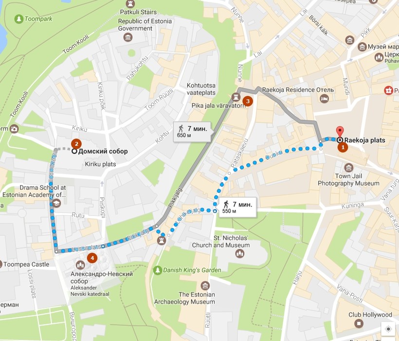 От Ратушной площади (1) к Домскому собору (2) можно добраться всего за 7 минут, минуя ворота Pika jala väravatorn (3) и поднявшись по моей любимой улице Пикк Ялг (на которой есть замечательное одноименное кафе) на Дворцовую площадь. Слева будет православный кафедральный собор им. Александра Невского (4). Сверните направо и по улочке Toom-Kooli дойдите до конца, где Toom-Kooli встречается с Церковной площадью (Kiriku plats), где и находится Домская церковь Святой Девы Марии.