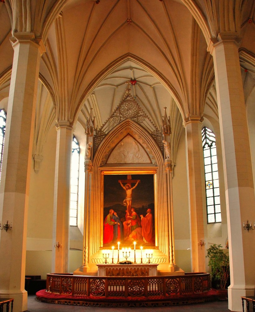 Внутри вы не увидите богатых фресок, зато можно вдоволь насмотреться на сводчатые потолки и живописное полотно над алтарем, изображающее распятие.