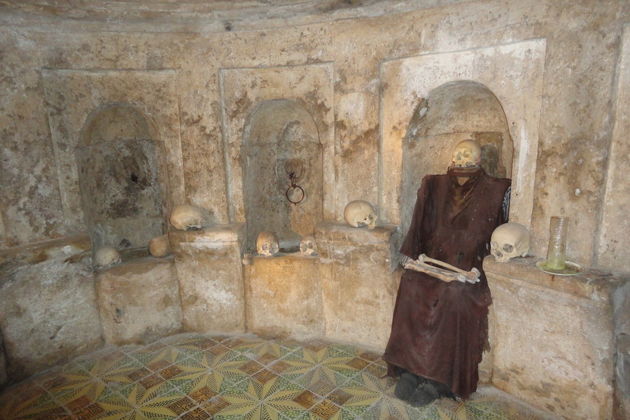 Сначала мы побываем в необычной пещерной церквушке, вошедшей в 20-ку самых популярных и посещаемых достопримечательностей Калабрии. Былая роспись сводов пещеры видна лишь кое-где, но скульптурные композиции из туфа неплохо сохранились.