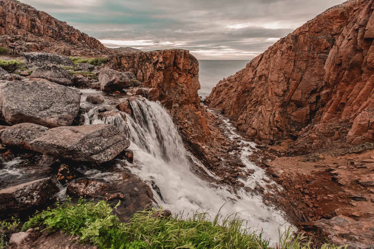Батарейский водопад: вы увидите рубиновые скалы и потоки чистейшей воды, уносящиеся в море по каньону. А с близлежащего холма нам откроется чудесная панорама Баренцева моря и Малого Батарейского озера.