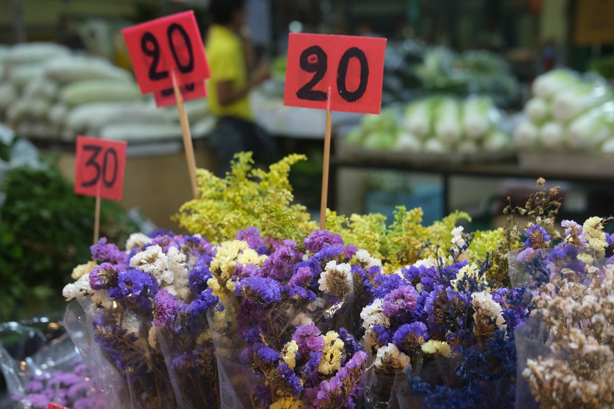 19:00 — цветочный рынок Pak Khlong Talat, павильон Yotpiman, панорама вечернего города с верхней веранды павильона, прогулка по ночному цветочному рынку