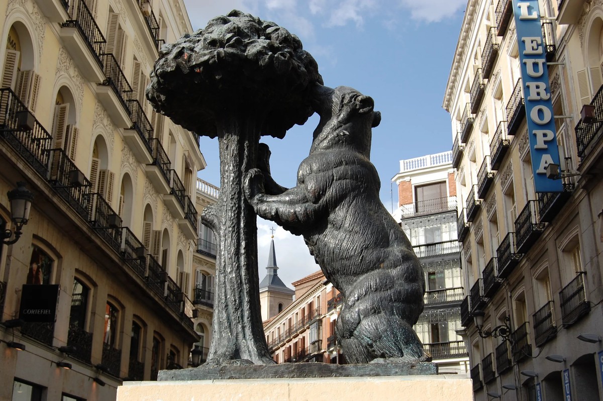 - Площадь Пуэрта-дель-Соль, где мы встретимся у статуи «Медведь и земляничное дерево» (здесь традиционно начинаются экскурсии). Я расскажу о том, почему это животное стало символом столицы, а также о гербах Мадрида-города и Мадрида-провинции.