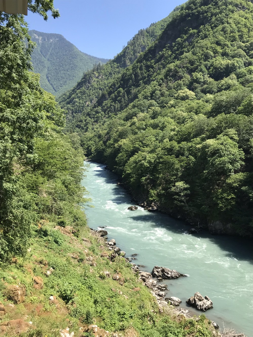 - Три ущелья — мы проедем Бзыбское, Гегское и Юпшарское ущелья. Погуляем по подвесному мосту над рекой и рассмотрим храм X века.