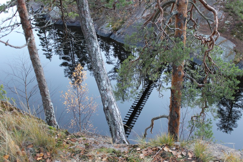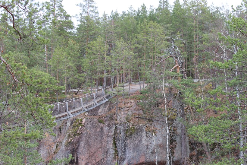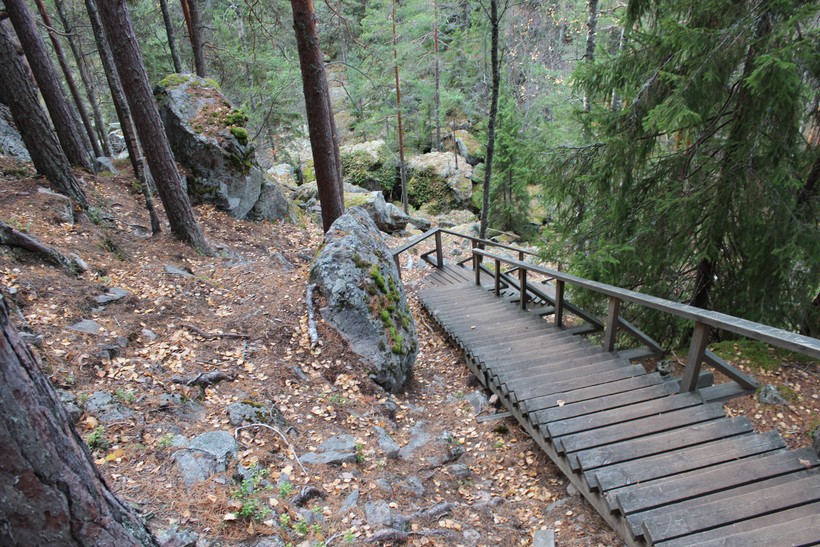 На нескольких отрезках пути попадаются деревянные лестницы. Первая – Катаявуори (Katajavuori) – в полуторах километрах от начала маршрута, ведет на основную смотровую площадку. Однако те, кто любит сложности, карабкаются параллельно ступенькам по скале и камням. Здесь есть важный момент. Если захотите полазить, вы должны быть подготовленным к такой физической активности и иметь с собой соответствующую обувь.