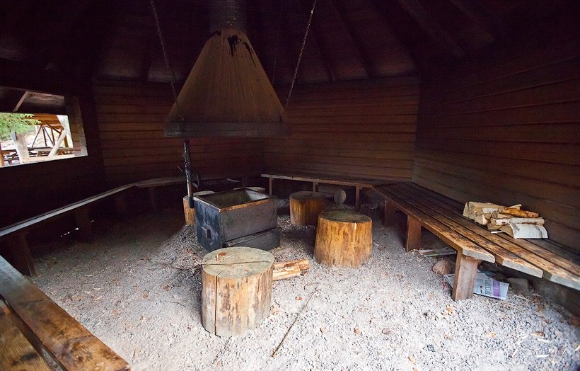 Уже перед выходом из парка, а точнее перед подвесным мостом, есть специально оборудованное место для пикника со всем, что нужно для костра, лавочками, беседками, даже поленницами и топорами.
