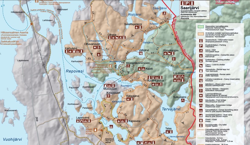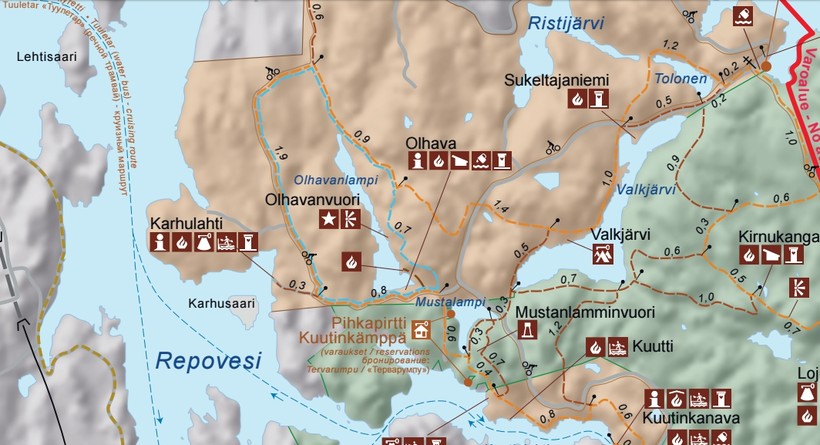- Маршрут "Кааккуринкиеррос" (Kaakkurinkierros) или "Краснозобая гагара" – 26 км. Самый длинный в Реповеси, охватывает все достопримечательности парка. Пешком его можно преодолеть за 3-4 дня. На карте ниже маршрут обозначен оранжевым пунктиром.